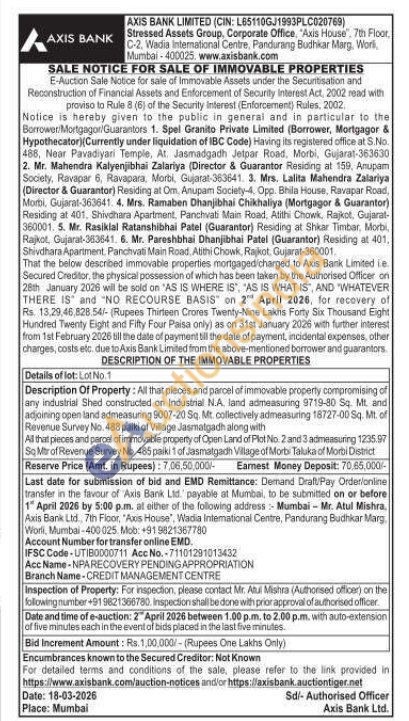 Description Of Property: All that pieces and parcel of immovable property compromising of any industrial Shed constructed on Industrial N.A. land admeasuring 9719-80 Sq. Mt. and adjoining open land admeasuring 9007-20 Sq. Mt. collectively admeasuring 18727-00 Sq. Mt. of Revenue Survey No. 488 paiki of Village Jasmatgadh along with All that pieces and parcel of immovable property of Open Land of Plot No. 2 and 3 admeasuring 1235.97 So Mtr of Revenue Survey No. 485 paiki 1 of Jasmatgadh Village of Morbi Taluka of Morbi District