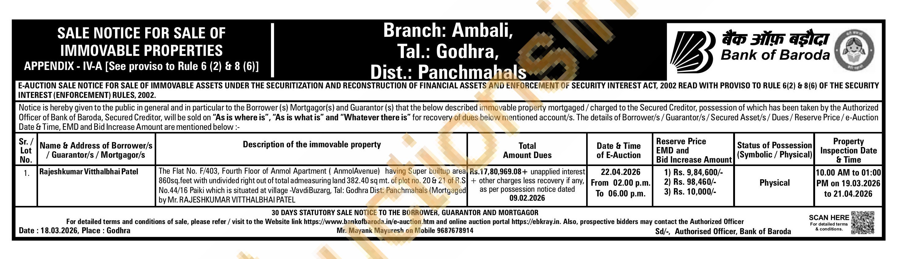 The Flat No. F/403, Fourth Floor of Anmol Apartment (AnmolAvenue having Super builtup area 860sq.feet with undivided right out of total admeasuring land 382.40 są mt. of plot no. 20 6 21 of R.S No.44/16 Paiki which is situated at village VavdiBuzarg, Tal. Godhra Dist: Panchmahals (Mortgaged by Mr. RAJESHKUMAR VITTHALBHAI PATEL