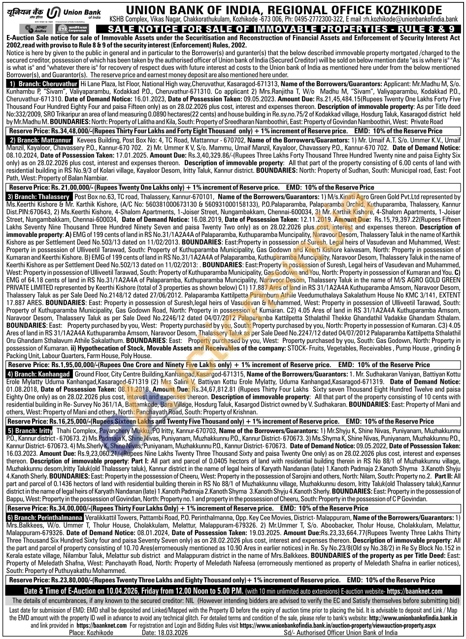 Description of immovable property: All the part and parcel of property consisting of 10.70 Ares (errorneously mentioned as 10.90 Ares in earlier notices) in Re. Sy No.23/8(Old sy No. 38/2) in Re Sy Block No. 152 in Kerala estate village, Nilambur Taluk, Melattur sub district and Malappuram district in the name of Mrs. Balkkees. BOUNDARIES of the property as per Title Deed: East: Property of Meledath Shafna, West: Panchayath Road, North: Property of Meledath Nafeesa (erroneously mentioned as property of Meledath Shafna in earlier notices), South: Property of Puthuyakathu Mohammed.
