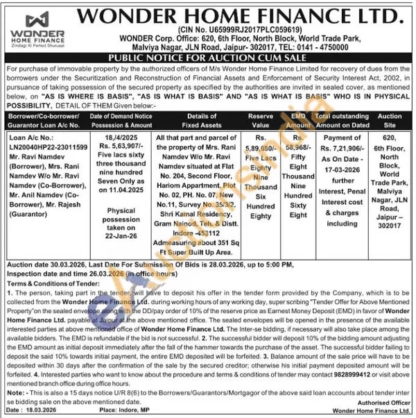 All that part and parcel of the property of Mrs. Rani Namdev W/o Mr. Ravi Namdev situated at Flat No. 204, Second Floor, Hariom Appartment, Plot No. 02, PH. No. 07, New No.11, Survey No. 35/3/2, Shri Kamal Residency, Gram Nainod, Teh. & Distt. Indore -453112 Admeasuring about 351 Sq Ft Super Built Up Area