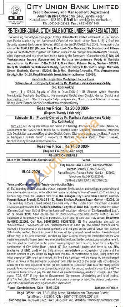 Item 1: 176.25 Sq.yds. of Site in D.No.1008/12-1-18, Situated within Macherla Municipality, Macherta Sub-District, Narasaraopet Registration District, Guntur District and bounded by East: Site of Kalagatia Satyanarayana etc, South Site of Marthala Srinivasa Reddy, West: Bazaar, North: Site of Marthala Venkata Reddy