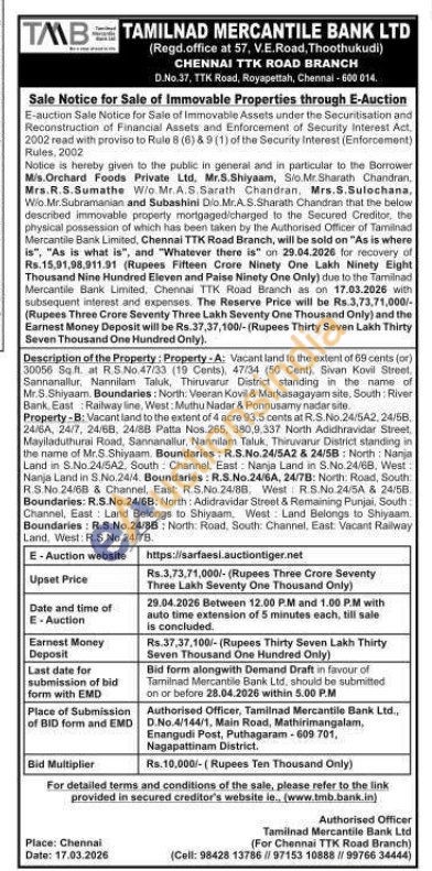 Vacant land to the extent of 69 cents (or) 30056 Sq.ft. at R.S.No.47/33 (19 Cents), 47/34 (50 Cent), Sivan Kovil Street, Sannanallur. Nannilam Taluk, Thiruvarur District standing in the name of Mr.S.Shiyaam. Boundaries: North: Veeran Kovil & Markasagayam site, South: River Bank East Railway line, West: Muthu Nadar & Ponnusamy nadar site Property-B: Vacant land to the extent of 4 acre 93.5 cents at R.S.No.24/5A2, 24/58, 24/6A, 24/7, 24/68, 24/88 Patta Nos 265, 380,9,337 North Adidhravidar Street, Mayiladuthurai Road, Sannanallur, Nannilam Taluk, Thiruvarur District standing in the name of Mr.S. Shiyaam. Boundaries: R.S.No.24/5A2 & 24/5B: North: Nanja Land in S.No.24/5A2, South Channel, East Nanja Land in S.No.24/68, West Nanja Land in S.No.24/4, Boundaries: R.S.No.24/6A, 24/78: North. Road, South R.S.No.24/68 & Channel, East: R.S.No.24/86, West R.S.No.24/5A & 24/58 Boundaries: R.S.No.24/6B: North: Adidravidar Street & Remaining Punjai, South Channel, East Land Belongs to Shiyaam, West Land Belongs to Shiyaam. Boundaries: R.S.No.24/8B: North Road, South: Channel, East: Vacant Railway Land. West: R.S. No. 24/78