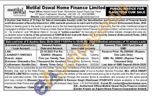 • Auction Start Date :  09-04-2026 11:00 AM