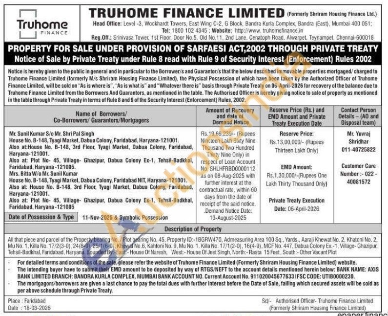 All that piece and parcel of the Property bearing No./Plot bearing No. 45, Property ID:-1BGRW470, Admeasuring Area 100 Sq., Yards., Aaraji Khewat No. 2, Khatoni No. 2. Mu No. 1, Killa No. 17/2(3-0), 24(8-0), 25/1(6-0), Khewat No. 6, Kahtoni No. 9, Mu No. 1. Killa No. 17/1(2-0), 16(4-9), MCF No. 447, Dabua Colony Ex.-1, Village-Ghazipur, Tehsil-Badkhal, Faridabad, Haryana. Bounded By:-East:-House Of Naresh, West-House Of Jeet Singh, North:-Rasta 15 Feet, South:- Other Vacant Plot