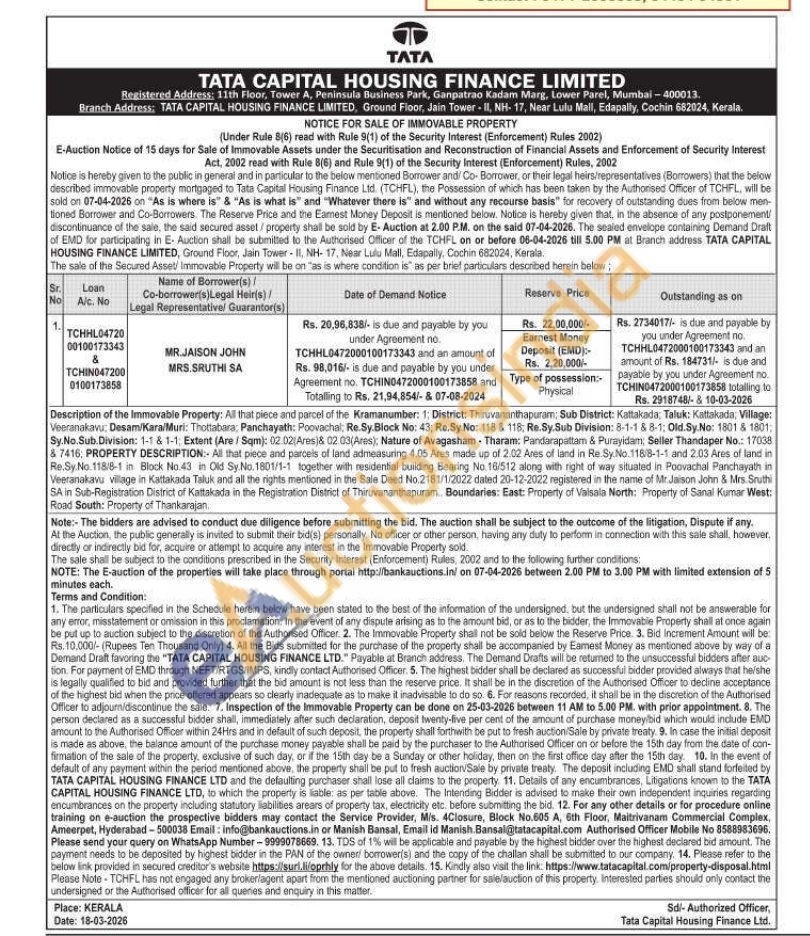 Description of the Immovable Property: All that piece and parcel of the Kramanumber: 1; District: Thiruvananthapuram; Sub District: Kattakada, Taluk: Kattakada, Village: Veeranakavu, Desam/Kara/Muri: Thottabara, Panchayath: Poovachal; Re.Sy. Block No: 43; Re.Sy.No: 118 8 118; Re. Sy Sub Division: 8-1-1 & 8-1; Old.Sy.No: 1801 & 1801. Sy.No.Sub. Division: 1-1 & 1-1: Extent (Are/Sqm): 02:02(Ares)& 02 03(Ares), Nature of Avagasham Tharam: Pandarapattam & Purayidam, Seller Thandaper No.: 17038 87416; PROPERTY DESCRIPTION: All that piece and parcels of land admeasuring 4.05 Ares made up of 2.02 Ares of land in Re Sy.No.118/8-1-1 and 2.03 Ares of land in Re.Sy No.118/8-1 in Block No.43 in Old Sy.No. 1801/1-1 together with residential building Bearing No 16/512 along with right of way situated in Poovachal Panchayath in Veeranakavu village in Kattakada Taluk and all the rights mentioned in the Sale Deed No.2181/1/2022 dated 20-12-2022 registered in the name of Mr. Jaison John & Mrs. Sruthi SA in Sub-Registration District of Kattakada in the Registration District of Thiruvananthapuram. Boundaries: East: Property of Valsala North: Property of Sanal Kumar West: Road South: Property of Thankarajan.