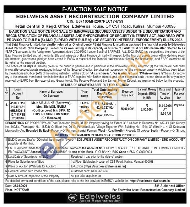 DESCRIPTION OF PROPERTY:- All That Piece And Parcel Of The Property Having An Extent Of 2.43 Ares In Resurvey No. 487/4/1 (Old Survey No. 100/5a, Thandapar No. 18503) Of Block No. 26 Of Perumbaikadu Village Together With Building No. 191a Of Ward No. 4 Of Kottayam Municipality And Bounded By East-Property Of Punnenparambil Punnen; West-Road North-Property Of Lukose South-Property Of Simon.