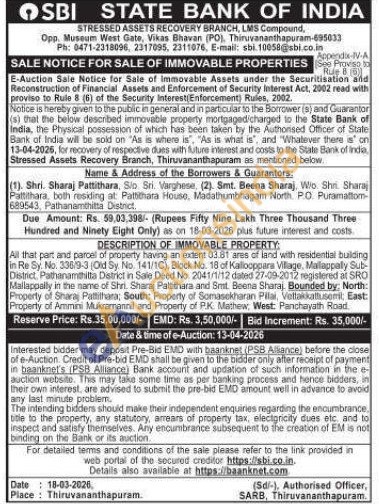 All that part and parcel of property having an extent 63.81 ares of of land with residential building in Re Sy. No. 336/9-3 (Old Sy No. 141/10), Block No. 18 of Kallooppara Village, Mallappally Sub-District Pathanamthitta District in Sale Deed No. 2041/1/12 dated 27-09-2012 registered at SRO Mallappally in the name of Shri Sharaj Pattithara and Smt. Beens Sharaj. Bounded by: North: Property of Sharay Pattithara, South: Property of Somasekharan Pilai, Voltakkattusormil; East: Property of Ammini Mukramannil and Property of P.K. Mathew: West: Panchayath Road