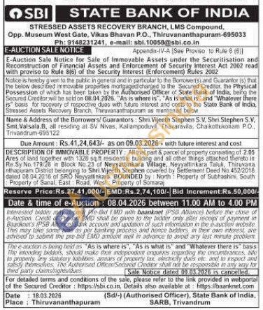 All that part & parcel of property consisting of 2:05 Ares of land together with 1328 sq ft residential building and all other things attached therato in Re. Sy No. 179/28 in Block No. 23 of Neyyattinkara Village, Neyyaltinkara Taluk. Thiruvana nthapuram District belonging to Shri Vijeeth Stephen covered by Settlement Deed No. 452/2016 dated 08.04.2016 of SRO Neyyatlinkara BOUNDED by North Property of Subhashini, South Property of Sanal East: Road, West Property of Somara