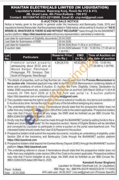Freehold landed property admeasuring about 20.52 acre at Mouza Sangur. Panchayat: Protapnagar. PS: Sonarpur, Dist South 24 Parganas, West Bengal
