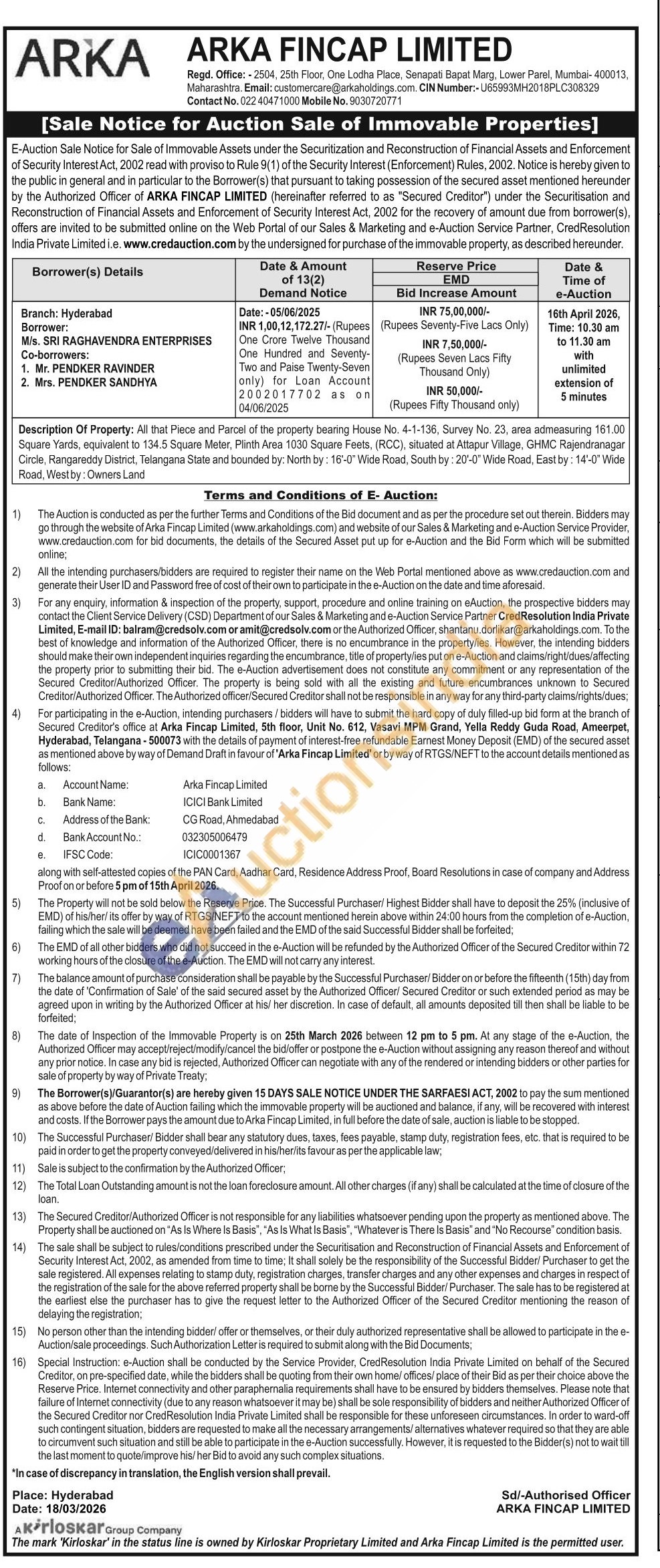 Description Of Property: All that Piece and Parcel of the property bearing House No. 4-1-136, Survey No. 23, area admeasuring 161.00 Square Yards, equivalent to 134.5 Square Meter, Plinth Area 1030 Square Feets, (RCC), situated at Attapur Village, GHMC Rajendranagar Circle, Rangareddy District, Telangana State and bounded by: North by: 16'-0" Wide Road, South by: 20'-0" Wide Road, East by: 14'-0" Wide Road, Westby: Owners Land