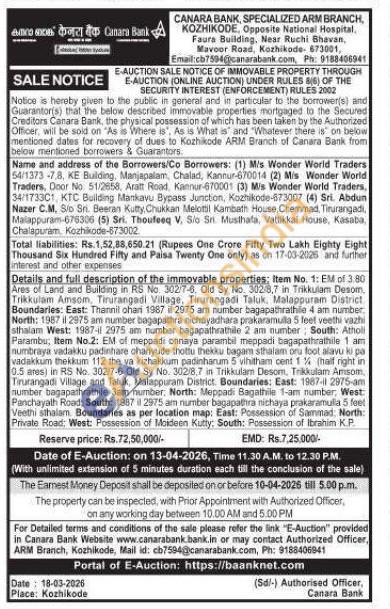 Details and full description of the immovable properties: Item No. 1: EM of 3.80 Ares of Land and Building in RS No. 302/7-6, Old Sy No. 302/8,7 in Trikkulam Desom, Trikkulam Amsom, Tirurangodi Village, Tirurangadi Taluk. Malappuram District Boundaries: East: Thannil ohan 1987 il 2975 am number bagapathrathile 4 am number North: 1987 il 2975 am number bagapathra nichayadhara prakaramulla 5 feet veethi vazhi sthalam West: 1987-1 2975 am number bagapathrathile 2 am number: South: Atholl Parambu, Item No.2: EM of meppadi onnaya parambil meppadi bagapathrathile 1 am numbraya vadakku padinhare chariyude thottu thekku bagam sthalam oru foot alavu ki pa vadakkum thekkum 112 the va kizhakkum padinhanum 5 5 vihitha vihitham cent 1% (half right in 0.5 ates) in RS No. 302/7-6 Old Sy No. 302/8,7 in Trikkulam Desom, Trikkulam Ammsom, Tirurangadi Village and Taluk, Malappuram District. Boundaries: East: 1987-1 2975-am number bagapathrathile 3am number, North: Meppadi Bagathile 1-am number, West: Panchayath Road, South: 1987 il 2975 am number bagapathra nichaya prakaramulla 5 feet Veethi sthalam Boundaries as per location map: East: Possession of Sammad North: Private Road: West: Possession of Moideen Kutty: South: Possession of Ibrahim K.P.