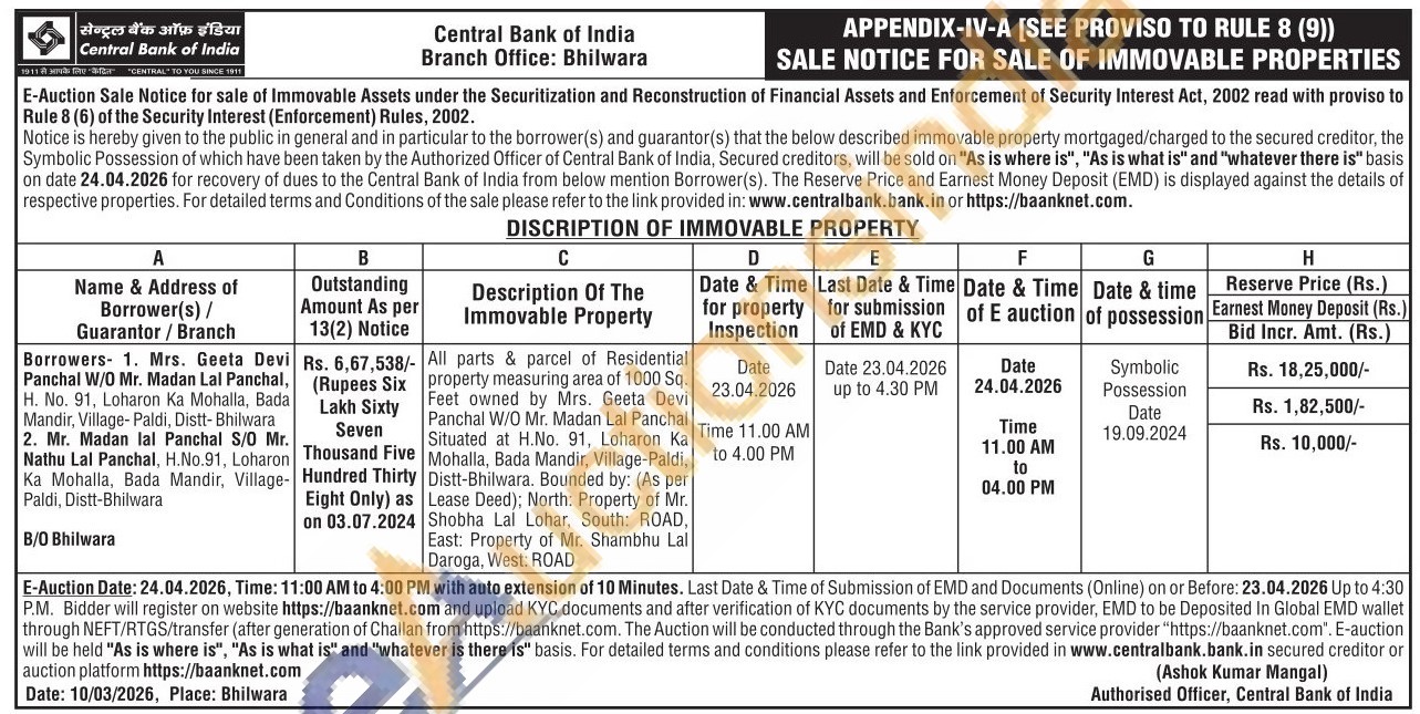 All parts & parcel of Residential property measuring area of 1000 Sq. Feet owned by Mrs. Geeta Devi Panchal W/O Mr. Madan Lal Panchal Situated at H.No. 91, Loharon Ka Mohalla, Bada Mandir, Village-Paldi, Distt-Bhilwara. Bounded by: (As per Lease Deed); North: Property of Mr. Shobha Lal Lohar, South: ROAD, East: Property of Mr. Shambhu Lal Daroga, West: ROAD
