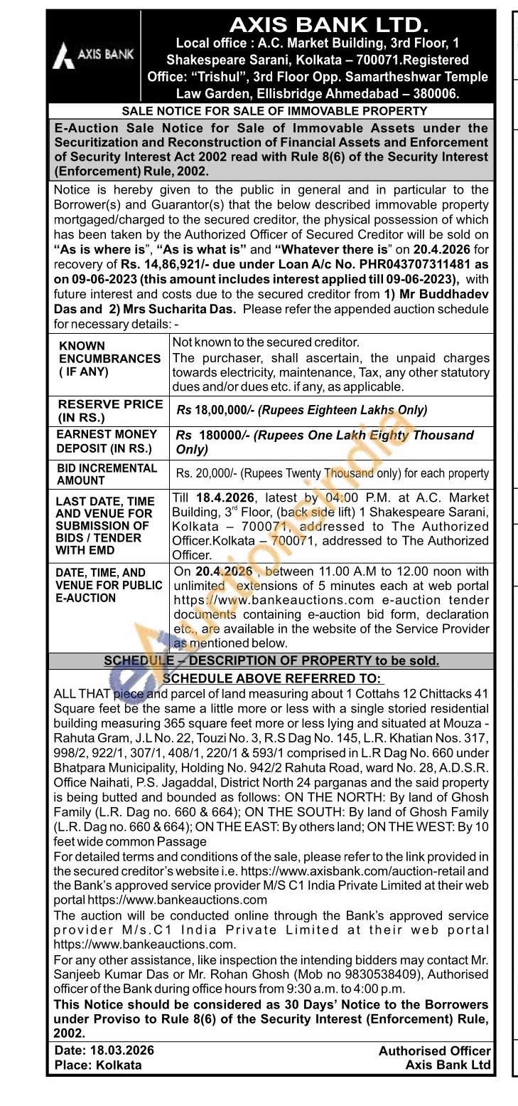 ALL THAT piece and parcel of land measuring about 1 Cottahs 12 Chittacks 41 Square feet be the same a little more or less with a single storied residential building measuring 365 square feet more or less lying and situated at Mouza -Rahuta Gram, J.L No. 22, Touzi No. 3, R.S Dag No. 145, L.R. Khatian Nos. 317, 998/2, 922/1, 307/1, 408/1, 220/1 & 593/1 comprised in L.R Dag No. 660 under Bhatpara Municipality, Holding No. 942/2 Rahuta Road, ward No. 28, A.D.S.R. Office Naihati, P.S. Jagaddal, District North 24 parganas and the said property is being butted and bounded as follows: ON THE NORTH: By land of Ghosh Family (L.R. Dag no. 660 & 664); ON THE SOUTH: By land of Ghosh Family (L.R. Dag no. 660 & 664); ON THE EAST: By others land; ON THE WEST: By 10 feet wide common