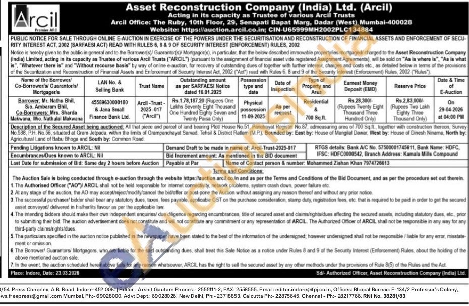Description of the Secured Asset being auctioned, All that piece and parcel of land bearing Plot House No. 51, Panchayat Register No 87, admeasuring area of 700 Sq.ft., together with construction thereon, Survey No.588, P.H. No.56, situated at Gram Jetpada, within the limits of Grampanchayat Sarvad, Tehsil & District Ratlam (M.P.). Bounded by. East by: House of Mangilal Dawar, West by: House of Dinesh Ninama, North by: Agricultural Land of Babu Bhoga and South by: Common Road