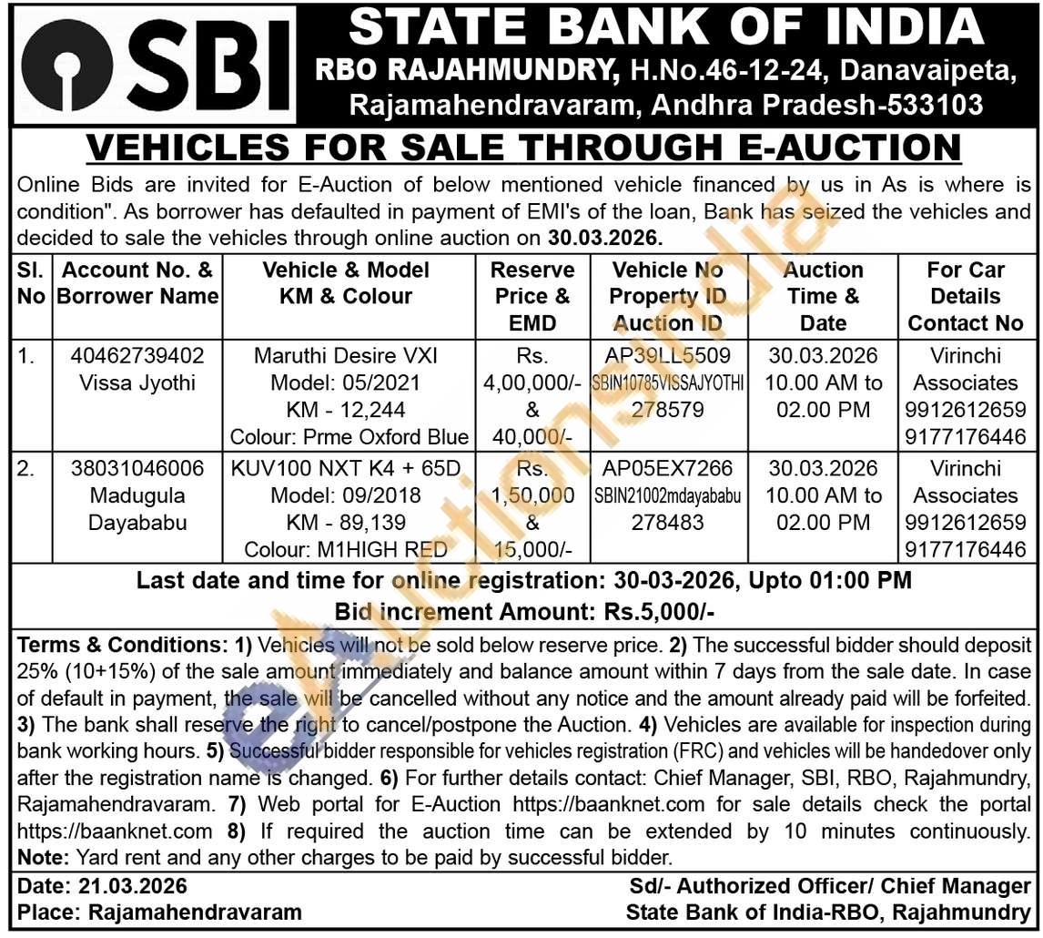 Vehicle No Property ID Auction ID : AP39LL5509 SBIN10785VISSAJYOTHI 278579