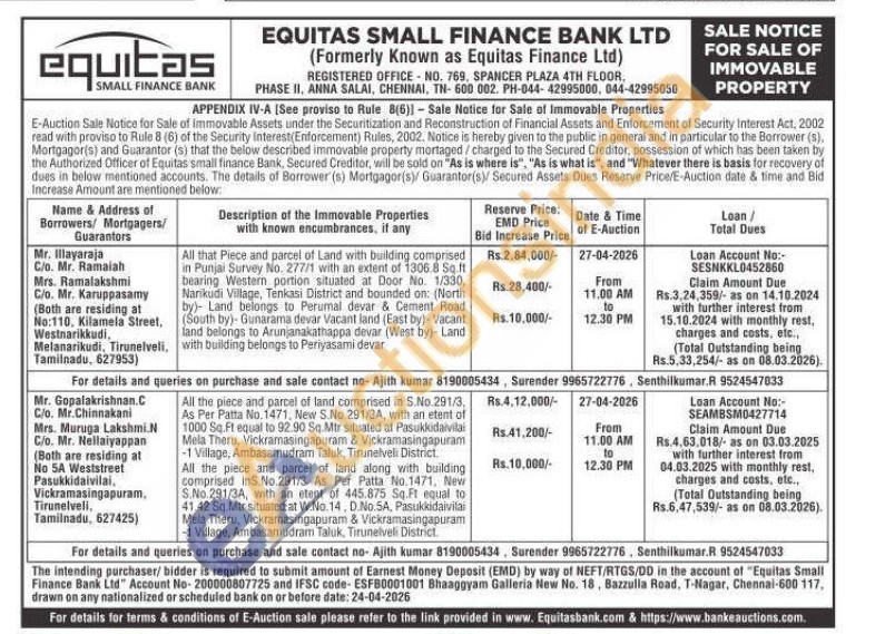 All the piece and parcel of land comprised in S.No.291/3, As Per Patta No. 1471, New S.No.291/3A, with an etent of 1000 Sq.Ft equal to 92.90 Sq.Mtr situated at Pasukkidaivilai Mela Theru, Vickramasingapuram & Vickramasingapuram -1 Village, Ambasamudram Taluk, Tirunelveli District. All the piece and parcel of land along with building comprised inS. No.291/3 As Per Patta No.1471, New S.No. 291/3A, with an etent of 445.875 Sq.Ft equal to 41.42 Sq.Mtr situated at W.No.14, D.No.5A, Pasukkidaivilai Mela Theru, Vickramasingapuram & Vickramasingapuram -1 Village, Ambasamudram Taluk, Tirunelveli District.