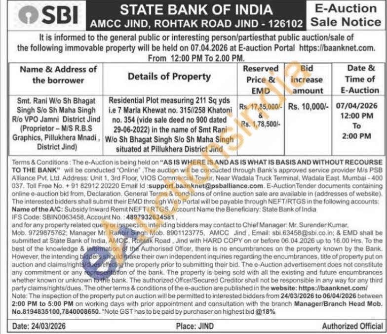 Residential Plot measuring 211 Sq yds i.e 7 Marla Khewat no. 315//258 Khatoni no. 354 (vide sale deed no 900 dated 29-06-2022) in the name of Smt Rani W/o Sh Bhagat Singh S/o Sh Maha Singh situated at Pillukhera District Jind