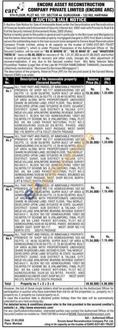 4 . ALL THAT PART AND PARCEL OF IMMOVABLE PROPERTY, PREMISIS OF SHOP NO.216 ADMEASURING 502.00 SQ.FTS IE 46.65 SQMTRS SUPER SUPER BUILT UP AREA & 8 ADMEASURING 278.05 SQ FTS. LE 25.84 SQ.MTRS BUILT UP AREA ALONG WITH PROPORTIONATE UNDIVIDED SHARE IN GROUND LAND SECOND FLOOR, RAJ WORLD" DEVELOPED UPON LAND SITUATED IN STATE: GUJARAT DISTRICT SURAT, SUB DISTRICT & TALUKA: CITY, MOJE VILLAGE APALNPORE BEARING REVENUE SURVEY NO.64/2-1. BLOCK NO.102 ADMEASURING 10927.00 SQ.MTRS TP SCHEME NO. 8 (PALANPORE), FINAL PLOT NO 68 NA LAND PAIKEE NOTIONAL PLOT NO.2 ADMEASURING 5539.00 SO.MTRS. PAIKEE AND BOUNDED AS UNDER EAST: SHOP NO.217 WEST SHOP NO 215, NORTH OTS SOUTH PASSAGE