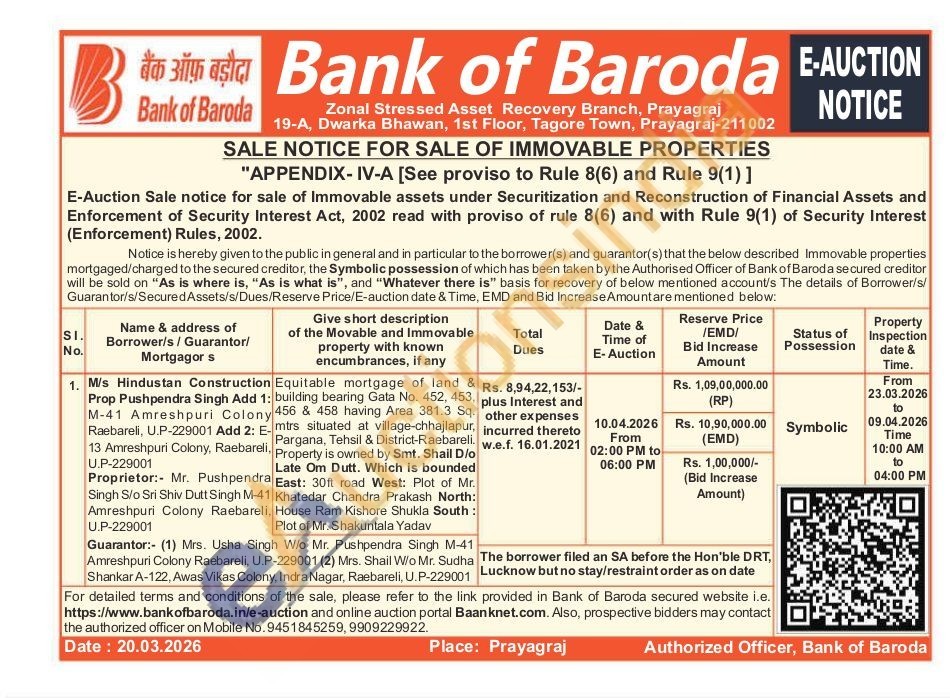 Equitable mortgage of land & building bearing Gata No. 452, 453, 456 & 458 having Area 381.3 Sq. mtrs situated at village-chhajlapur, Pargana, Tehsil & District-Raebareli. Property is owned by Smt. Shail D/o Late Om Dutt. Which is bounded East: 30ft road West: Plot of Mr. Khatedar Chandra Prakash North: House Ram Kishore Shukla South: Plot of Mr. Shakuntala Yadav