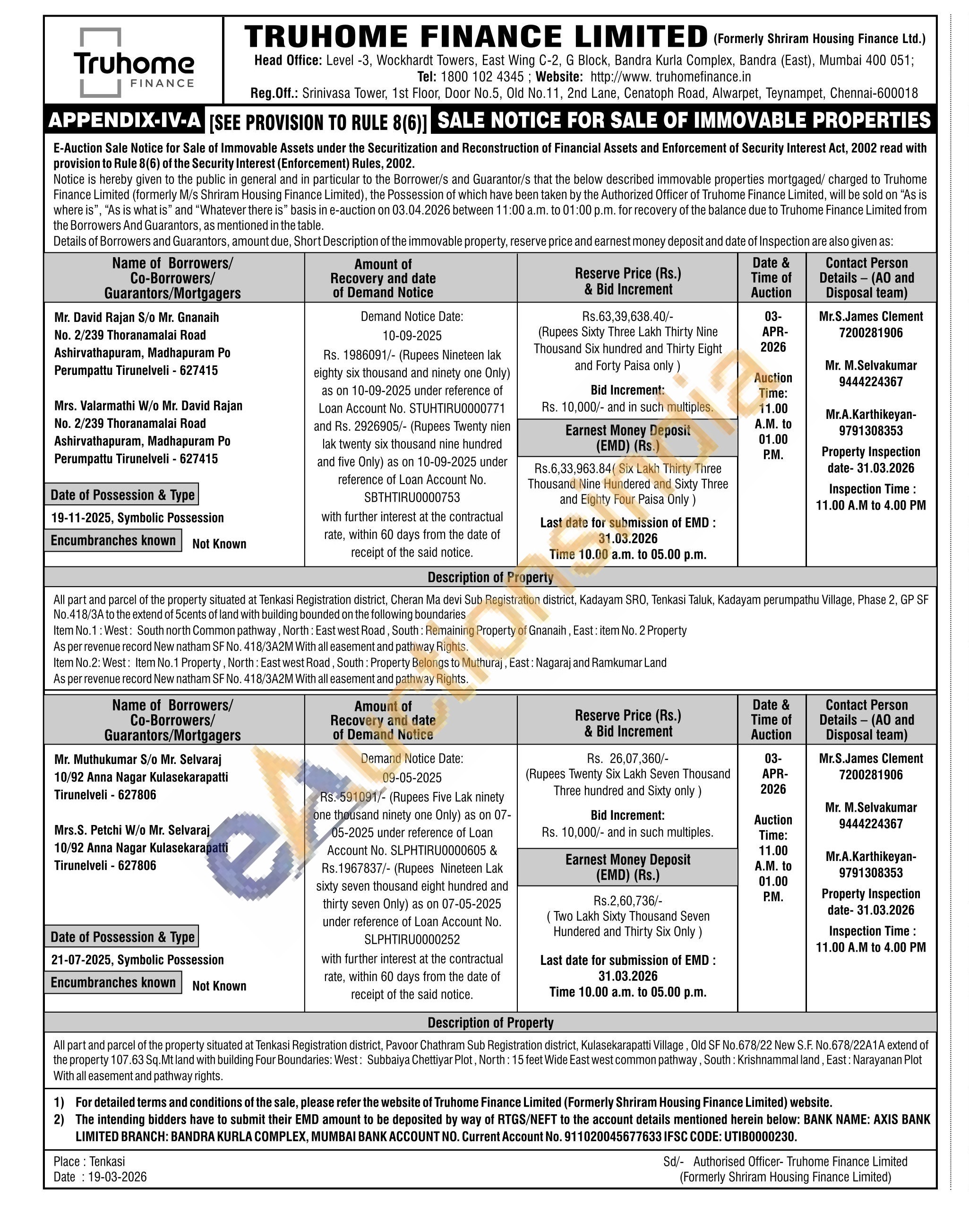 All part and parcel of the property situated at Tenkasi Registration district, Pavoor Chathram Sub Registration district, Kulasekarapatti Village, Old SF No.678/22 New S.F. No.678/22A1A extend of the property 107.63 Sq. Mt land with building Four Boundaries: West: Subbaiya Chettiyar Plot, North: 15 feet Wide East west common pathway, South: Krishnammal land, East: Narayanan Plot With all easement and pathway rights.