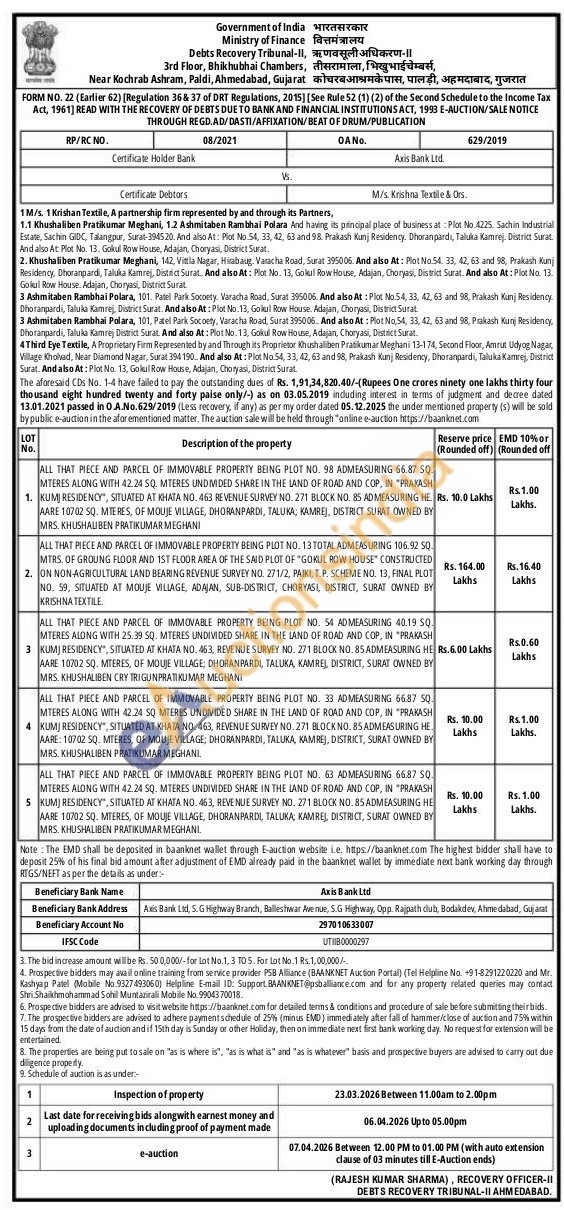 5 .ALL THAT PIECE AND PARCEL OF IMMOVABLE PROPERTY BEING PLOT NO. 63 AD MEASURING 66.87 SQ. MTERES ALONG WITH 42.24 SQ. MTERES UNDIVIDED SHARE IN THE LAND OF ROAD AND COP, IN "PRAKASH KUMJ RESIDENCY", SITUATED AT KHATA NO. 463, REVENUE SURVEY NO. 271 BLOCK NO. 85 ADMEASURING HE AARE 10702 SQ. MTERES, OF MOUJE VILLAGE, DHORANPARDI, TALUKA, KAMREJ, DISTRICT, SURAT OWNED BY MRS. KHUSHALIBEN PRATIKUMAR MEGHANI