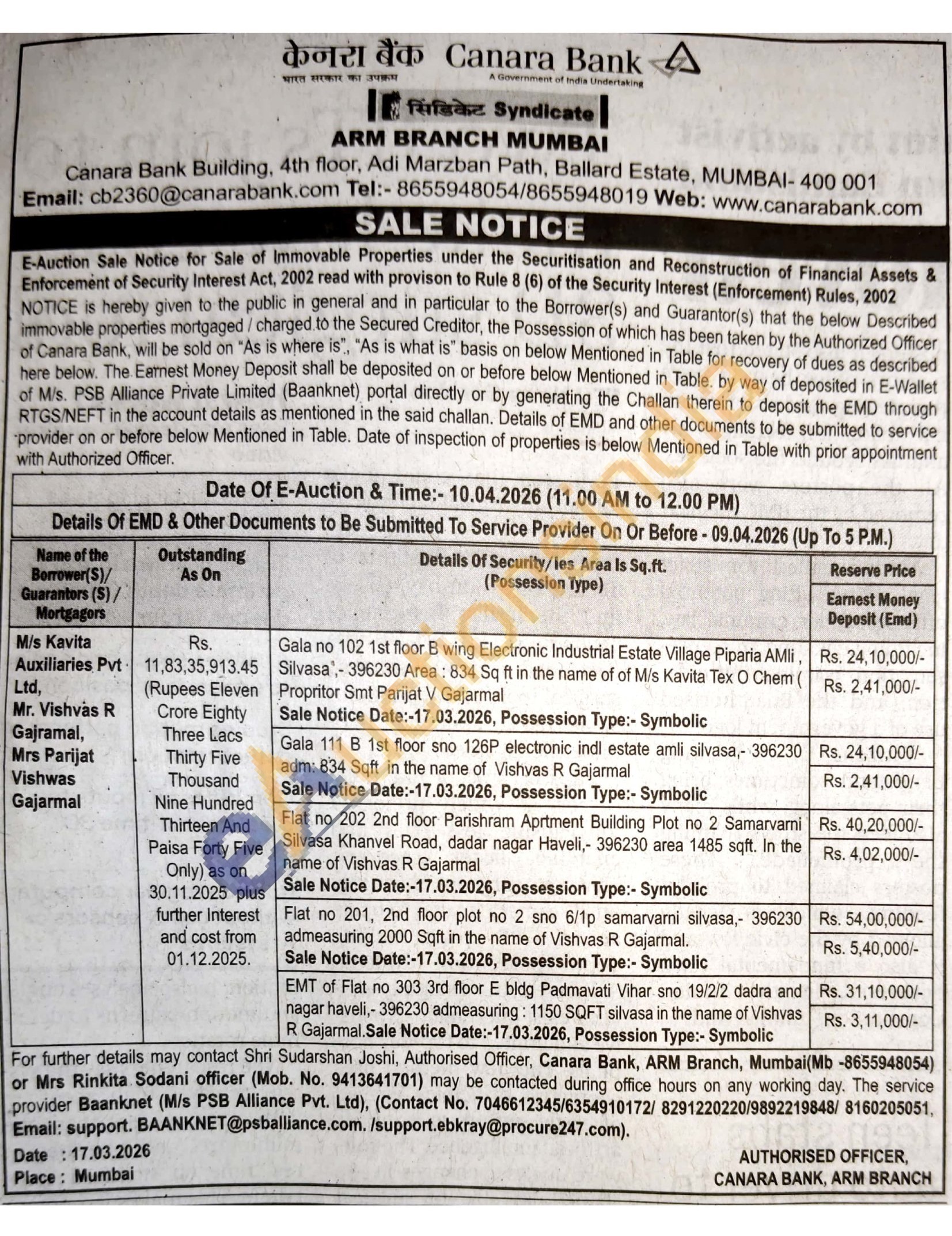 Sale Notice Date:-17.03.2026, Possession Type:- Symbolic