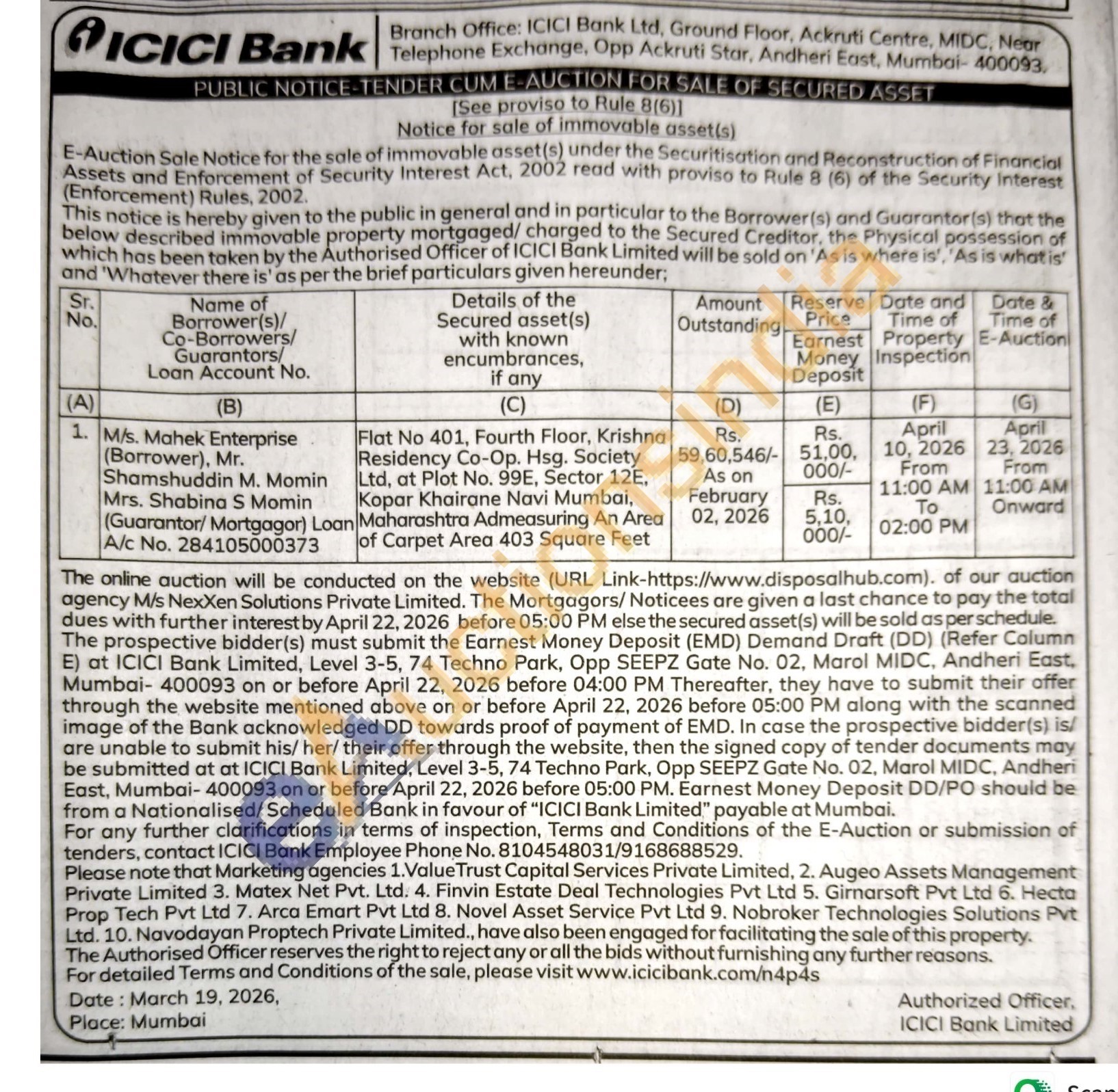 Flat No 401, Fourth Floor, Krishna Residency Co-Op. Hsg. Society Ltd, at Plot No. 99E, Sector 12E, Kopar Khairane Navi Mumbai, Maharashtra Admeasuring An Area of Carpet Area 403 Square Feet