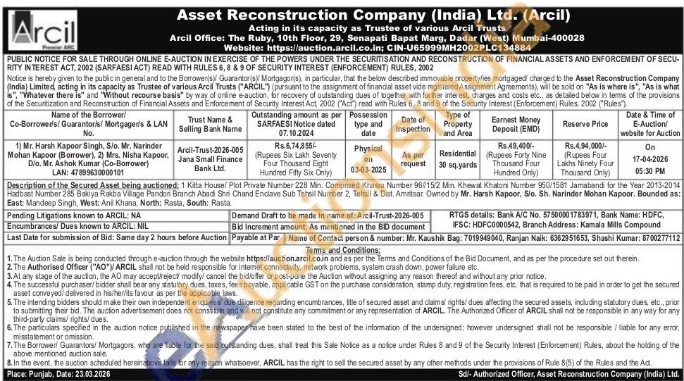 Kitta House/ Plot Private Number 228 Min. Comprised Khasra Number 96//15/2 Min. Khewat Khatoni Number 950/1581 Jamabandi for the Year 2013-2014 Hadbast Number 285 Bakiya Rakba Village Pandorni Branch Abadi Shri Chand Enclave Sub Tehsil Number 2, Tehsil & Dist. Amritsar. Owned by Mr. Harsh Kapoor, S/o. Sh. Narinder Mohan Kapoor. Bounded as: East: Mandeep Singh, West: Anil Khana, North: Rasta, South: Rasta