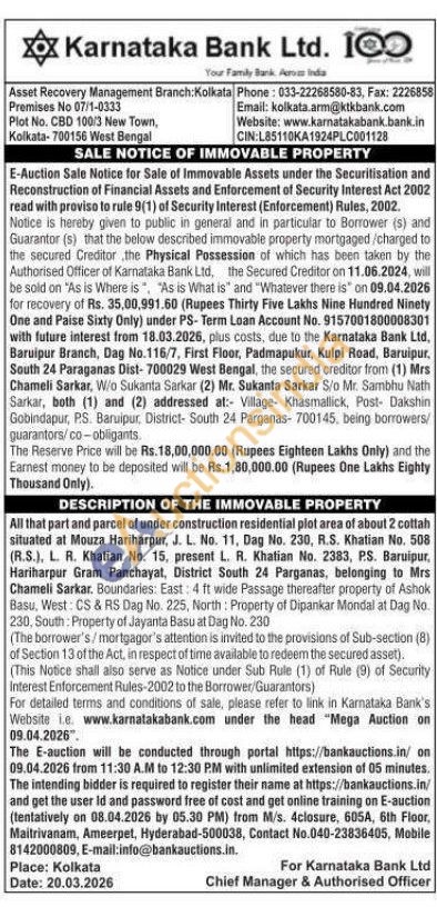 All that part and parcel of under construction residential plot area of about 2 cottah situated at Mouza Hariharpur, J. L. No. 11, Dag No. 230, R.S. Khatian No. 508 (R.S.), L. R. Khatian No. 15, present L. R. Khatian No. 2383, P.S. Baruipur, Hariharpur Gram Panchayat, District South 24 Parganas, belonging to Mrs Chameli Sarkar. Boundaries: East: 4 ft wide Passage thereafter property of Ashok Basu, West: CS & RS Dag No. 225, North: Property of Dipankar Mondal at Dag No. Interest Enforcement Rules-2002 to the Borrower Guarantors)