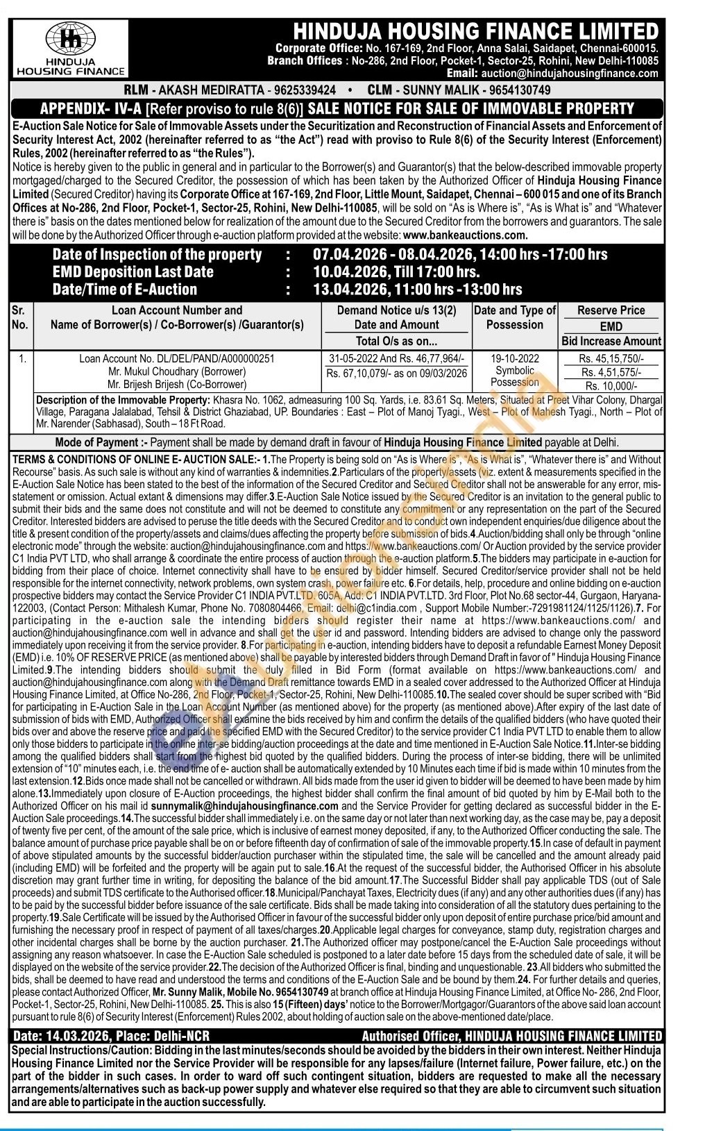 Description of the Immovable Property: Khasra No. 1062, admeasuring 100 Sq. Yards, i.e. 83.61 Sq. Meters, Situated at Preet Vihar Colony, Dhargal Village, Paragana Jalalabad, Tehsil & District Ghaziabad, UP. Boundaries: East Plot of Manoj Tyagi., West - Plot of Mahesh Tyagi., North Plot of Mr. Narender (Sabhasad), South-18 Ft Road.