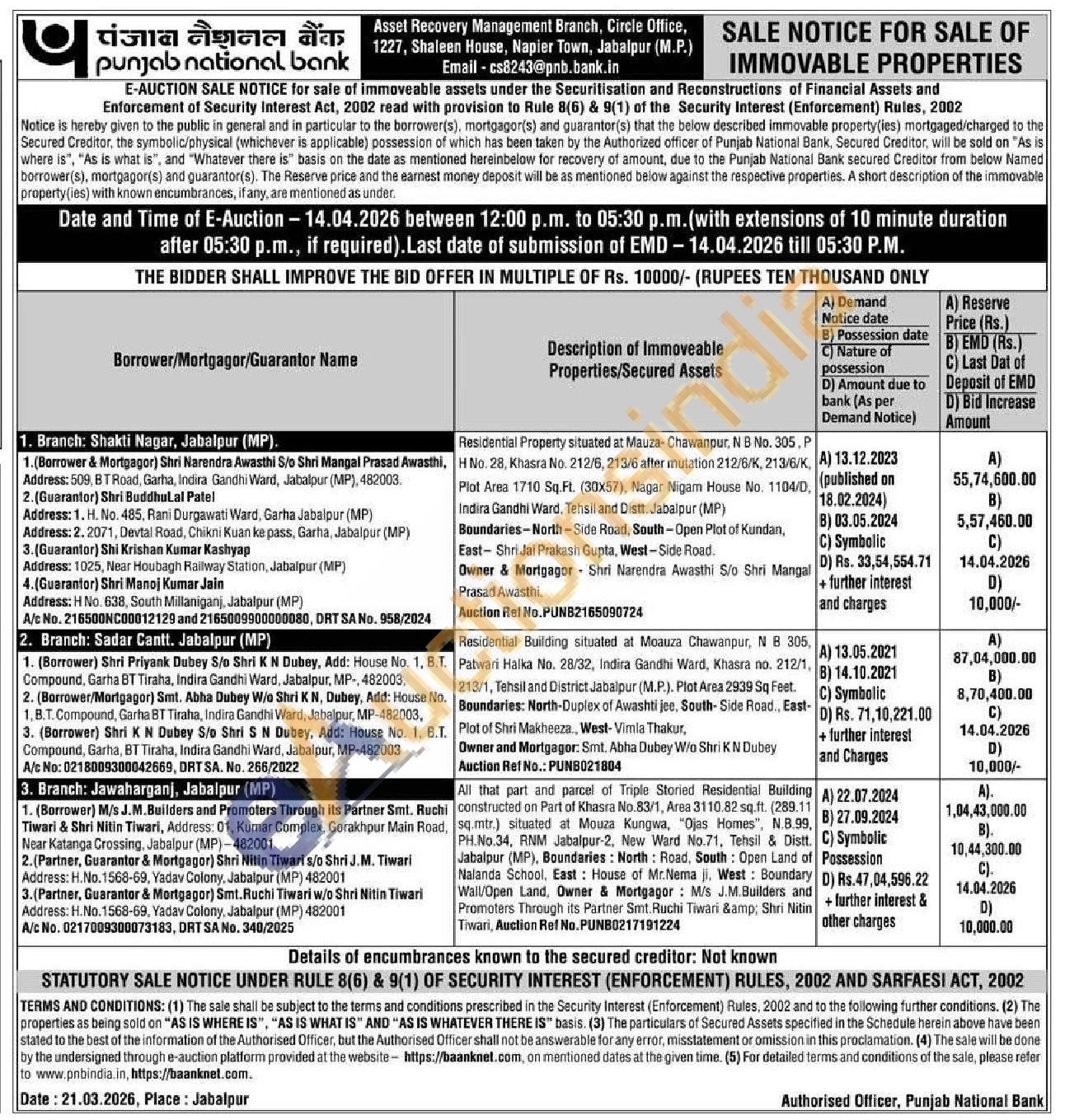 All that part and parcel of Triple Storied Residential Building constructed on Part of Khasra No.83/1, Area 3110.82 sq.ft. (289.11 sq.mtr.) situated at Mouza Kungwa, "Ojas Homes", N.8.99, PH.No.34, RNM Jabalpur-2, New Ward No.71. Tehsil & Distt. Jabalpur (MP), Boundaries: North Road, South: Open Land of Nalanda School, East: House of Mr.Nerma ||, West: Boundary Wall/Open Land, Owner & Mortgagor: M/s J.M.Builders and Promoters Through its Partner Smt. Ruchi Tiwari & Shri Nitin Tiwari, Auction Ref No. PUNB0217191224