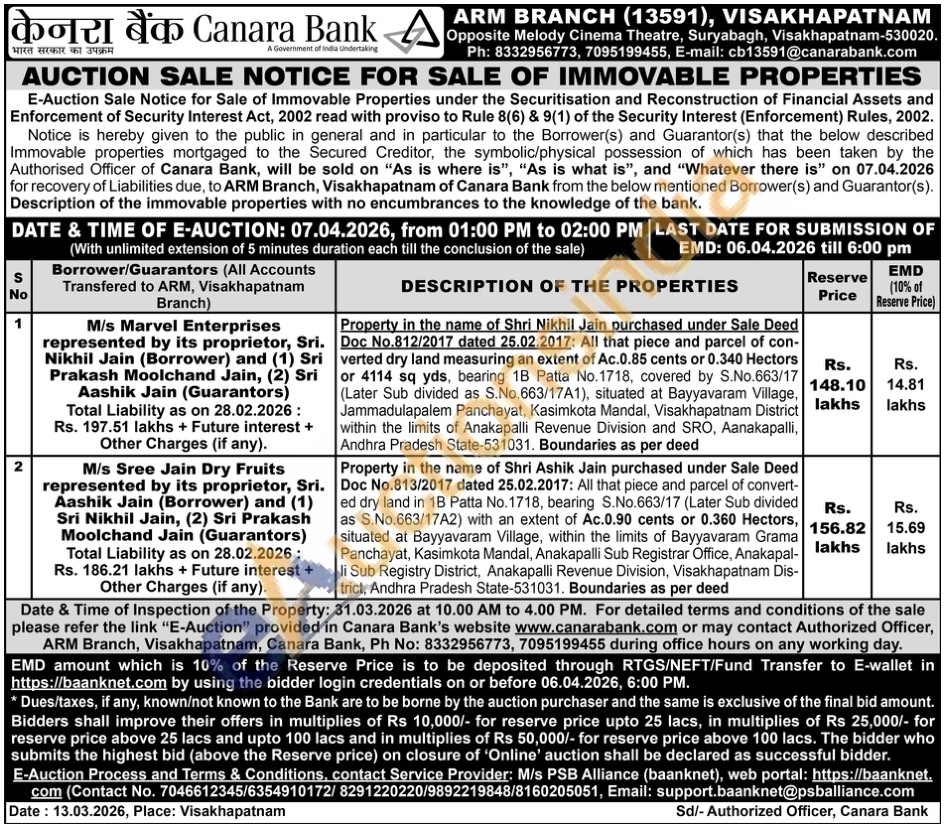 Doc No.812/2017 dated 25.02.2017: All that piece and parcel of con-verted dry land measuring an extent of Ac.0.85 cents or 0.340 Hectors or 4114 sq yds, bearing 1B Patta No.1718, covered by S.No.663/17 (Later Sub divided as S.No.663/17A1), situated at Bayyavaram Village, Jammadulapalem Panchayat, Kasimkota Mandal, Visakhapatnam District within the limits of Anakapalli Revenue Division and SRO, Aanakapalli, Andhra Pradesh State-531031. Boundaries as per deed