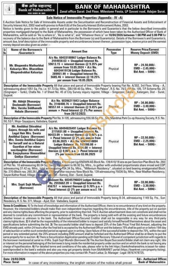 1. All that piece and parcel of Immovable Property bearing Flat No. A/302, 3rd Floor, Wing-A. admeasuring about 1051 Sq. Fts. ie. 97.73 Sq. Mtrs., SBU 69.40 Sq. Mtrs, "Om Palace", R.S. No. 79/2, F.P No. 105, TP. Scheme No. 25 (Singraper-Tunki), Chalta No. 1 of Sheet No. 45 of City Survey inquiry register, Village Singanpor, Taluka Katargam, Dist-Surat, Gujarat.