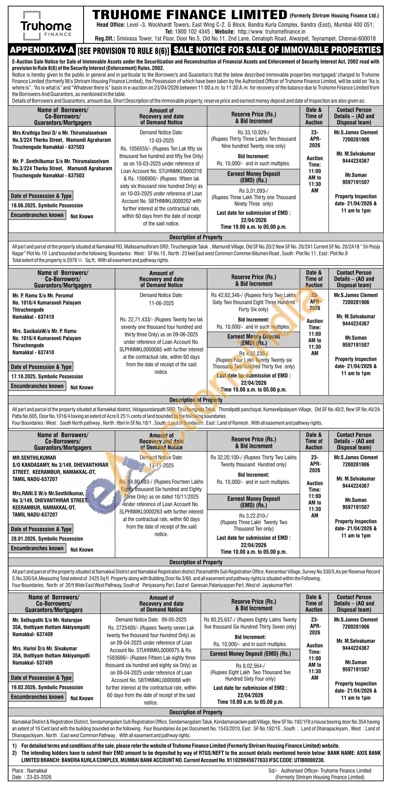 Namakkal District & Registration District, Sendamangalam Sub Registration Office, Sendamangalam Taluk, Kondamanaicken patti Village, New SF No. 192/1F8 a house bearing door No.35A having an extent of 16 Cent land with the building bounded on the following. Four Boundaries As per Document