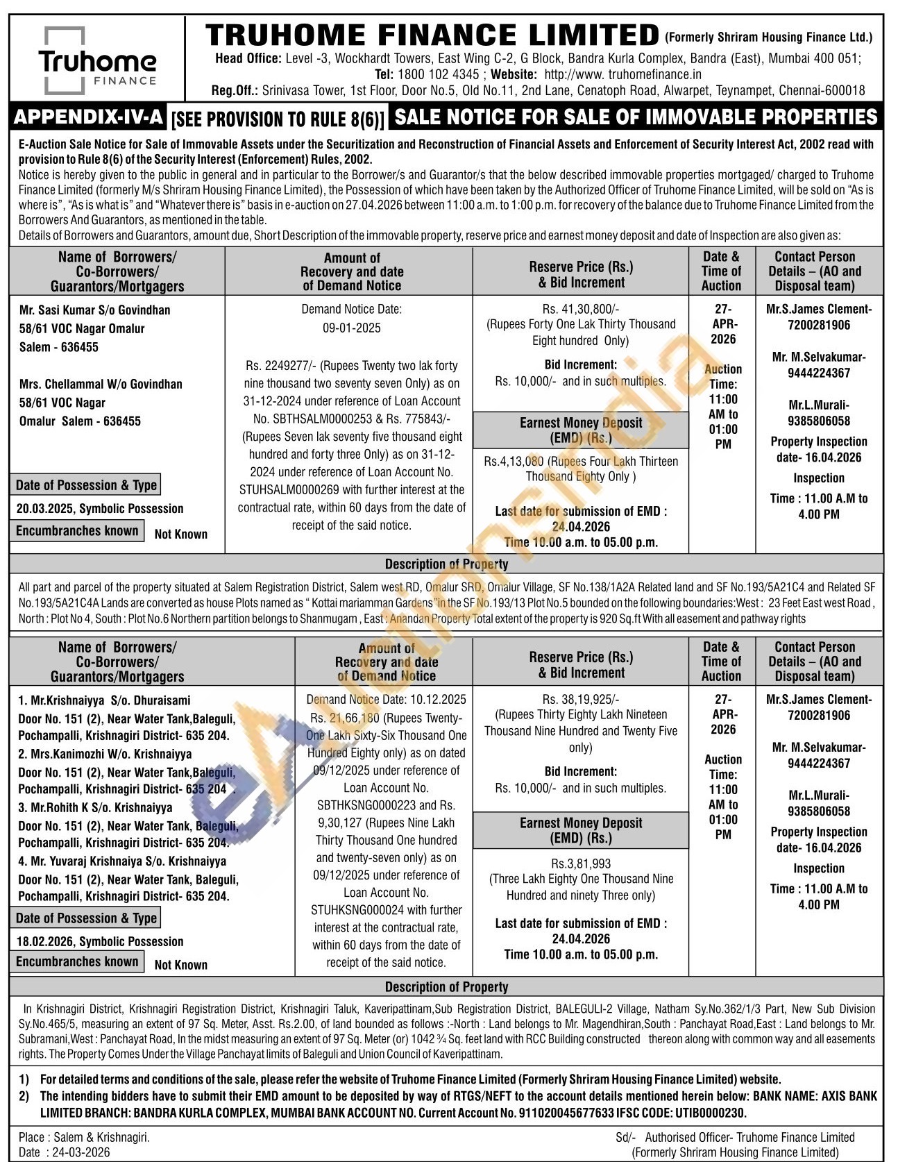 All part and parcel of the property situated at Salem Registration District, Salem west RD, Omalur SRD, Omalur Village, SF No. 138/1A2A Related land and SF No.193/5A21C4 and Related SF No. 193/5A21C4A Lands are converted as house Plots named as "Kottai mariamman Gardens"in the SF No. 193/13 Plot No.5 bounded on the following boundaries: West: 23 Feet East west Road, North: Plot No 4. South: Plot No.6 Northern partition belongs to Shanmugam, East: Anandan Property Total extent of the property is 920 Sq.ft With all easement and pathway rights
