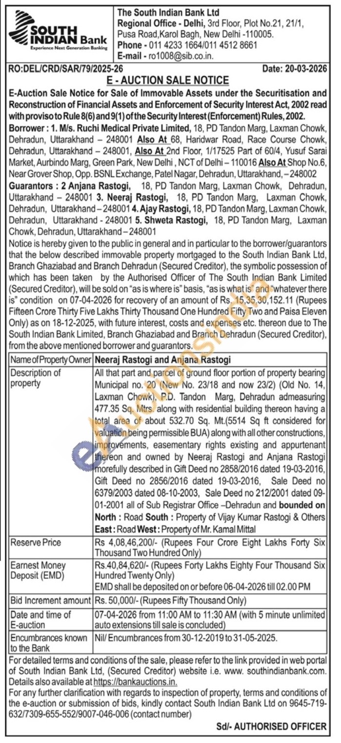 All that part and parcel of ground floor portion of property bearing Municipal no. 20 (New No. 23/18 and now 23/2) (Old No. 14. Laxman Chowk), P.D. Tandon Marg, Dehradun admeasuring 477.35 Sq. Mtrs. along with residential building thereon having a total area of about 532.70 Sq. Mt.(5514 Sq ft considered for valuation being permissible BUA) along with all other constructions, improvements, easementary rights existing and appurtenant thereon and owned by Neeraj Rastogi and Anjana Rastogi morefully described in Gift Deed no 2858/2016 dated 19-03-2016, Gift Deed no 2856/2016 dated 19-03-2016, Sale Deed no 6379/2003 dated 08-10-2003, Sale Deed no 212/2001 dated 09-01-2001 all of Sub Registrar Office-Dehradun and bounded on North: Road South: Property of Vijay Kumar Rastogi & Others East: Road West: Property of Mr. Kamal Mittal