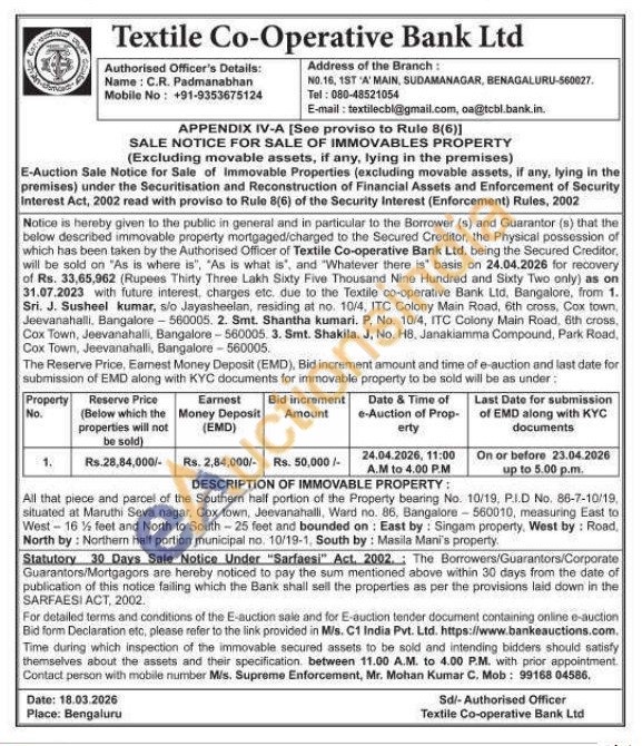 All that piece and parcel of the Southern half portion of the Property bearing No. 10/19, P.I.D No. 86-7-10/19, situated at Maruthi Seva nagar, Cox town, Jeevanahalli, Ward no. 86. Bangalore-560010, measuring East to West-16% feet and North to South-25 feet and bounded on: East by: Singam property, West by: Road, North by: Northern half portion municipal no. 10/19-1, South by: Masila Mani's property.