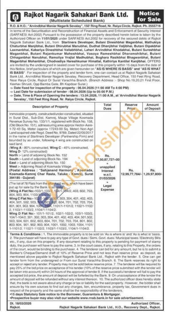 (The list of 78 Flats from the aforesaid wing, which have been put up for sale by the Bank is as under). (Wing A Flat No:-103/1-103/2 104/1-104/2, 403, 602, 703, 804,903,904, 1103/1-1103/2 Wing C Flat No:- 102/1-102/2, 301, 303, 304, 401, 402, 403, 404, 501, 502, 503, 504, 601, 602, 604,701, 702, 703, 704, 801,901,903,904, 1001, 1004, 1101/1-1101/2, 1102/3-1102/2.1103/1-1103/2 1104/1-1104/2 Wing D Flat No:- 101/1-101/2, 102/1-102/2, 103/1-103/2, 104/1-104/2,301, 302, 303, 304, 401, 402, 403, 404, 501,502, 503, 504, 601, 602, 603, 604,701, 702, 703, 704, 801, 802. 803,804, 901,902,903, 904, 1001, 1002, 1003, 1004, 1101/1-1101/21102/1-1102/2, 1103/1-1103/2, 1104/1-1104