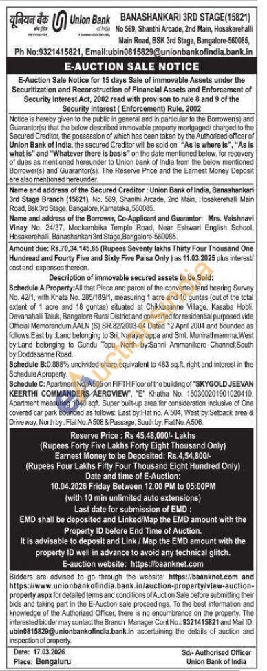 Schedule A Property:All that Piece and parcel of the converted land bearing Survey No. 42/1, with Khata No. 285/189/1, measuring 1 acre and 10 guntas (out of the total extent of 1 acre and 18 guntas) situated at Chikkasanne Village, Kasaba Hobli, Devanahalli Taluk, Bangalore Rural District and converted for residential purposed vide Official Memorandum AALN (S) SR.82/2003-04 Dated 12 April 2004 and bounded as follows East by :Land belonging to Sri. Narayanappa and Smt. Munirathnamma; West by:Land belonging to Gundu Topu, North by Sanni Ammanikere Channel, South by Doddasanne Road Schedule B:0.888% undivided share equivalent to 483 sq.ft, right and interest in the Schedule Aproperty. Schedule C: Apartment No. A 505 on FIFTH Floor of the building of "SKYGOLD JEEVAN KEERTHI COMMANDERS AEROVIEW", "E" Khatha No. 150300201901020410, Apartment measuring 1040 sqft. Super built-up area for consideration inclusive of One covered car park bounded as follows: East by Flat no. A 504, West by:Setback area & Drive way, North by: Flat No A508 & Passage, South by: Flat No A506.