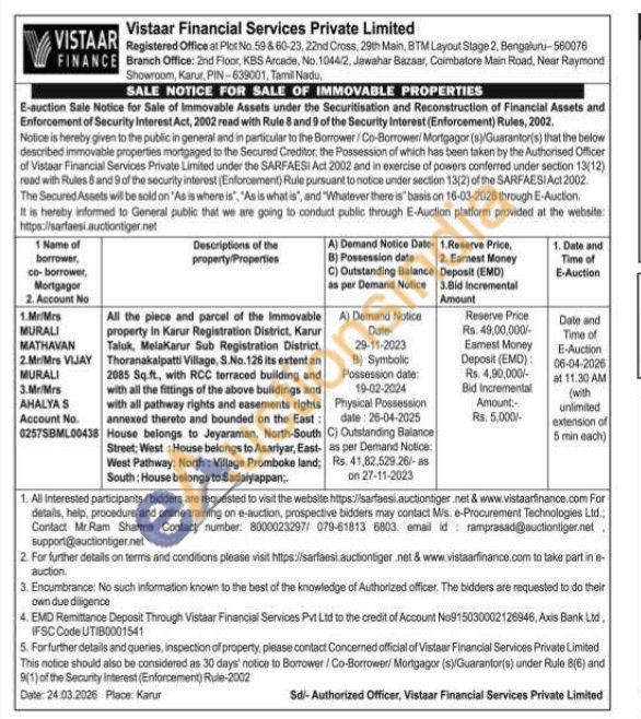 All the piece and parcel of the Immovable property In Karur Registration District, Karur Taluk, MelaKarur Sub Registration District, Thoranakalpatti Village, S.No. 126 its extent an 2085 Sq.ft., with RCC terraced building and with all the fittings of the above buildings and with all pathway rights and easements rights annexed thereto and bounded on the East Street, West: House belongs to Asariyar, East-West Pathway; North: Village Promboke land; South: House belongs to Sadalyappan:. House belongs to Jeyaraman, North-South