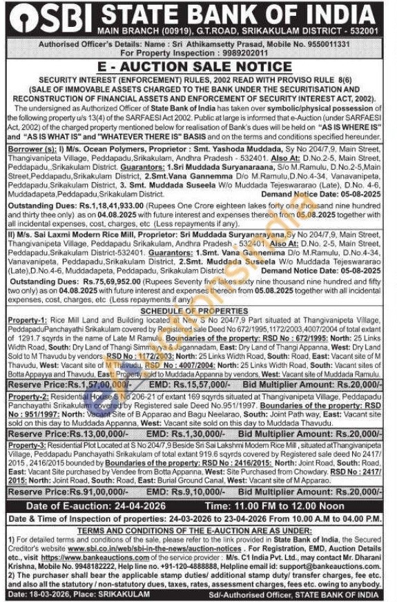 Property-2: Residential House S No 206-21 of extant 169 sqyrds situated at Thangivanipeta Village, Peddapadu Panchayathi Srikakulam covered by Registered sale Deed No.951/1997. Boundaries of the property: RSD No: 951/1997: North: Vacant Site of B Apparao and Bagu Neelarao, South: Joint Path way, East: Vacant site sold on this day to Muddada Appanna, West: Vacant site sold on this day to Muddada Thavudu.