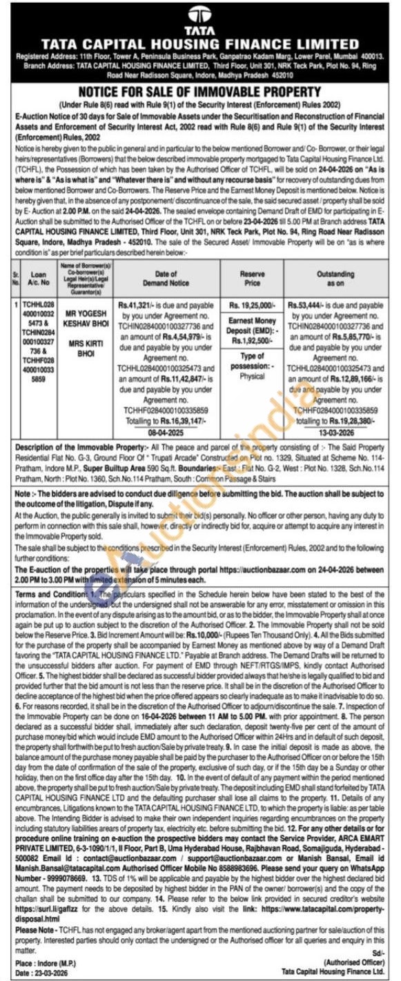 Description of the Immovable Property:- All The peace and parcel of the property consisting of The Said Property Residential Flat No. G-3, Ground Floor Of Trupati Arcade Constructed on Plot no. 1329, Situated at Scheme No. 114-Pratham, Indore M.P. Super Builtup Area 590 Sq.ft. Boundaries: East: Flat No. G-2, West: Plot No. 1328, Sch.No.114 Pratham, North: Plot No. 1360, Sch. No. 114 Pratham, South: Common Passage & Stairs