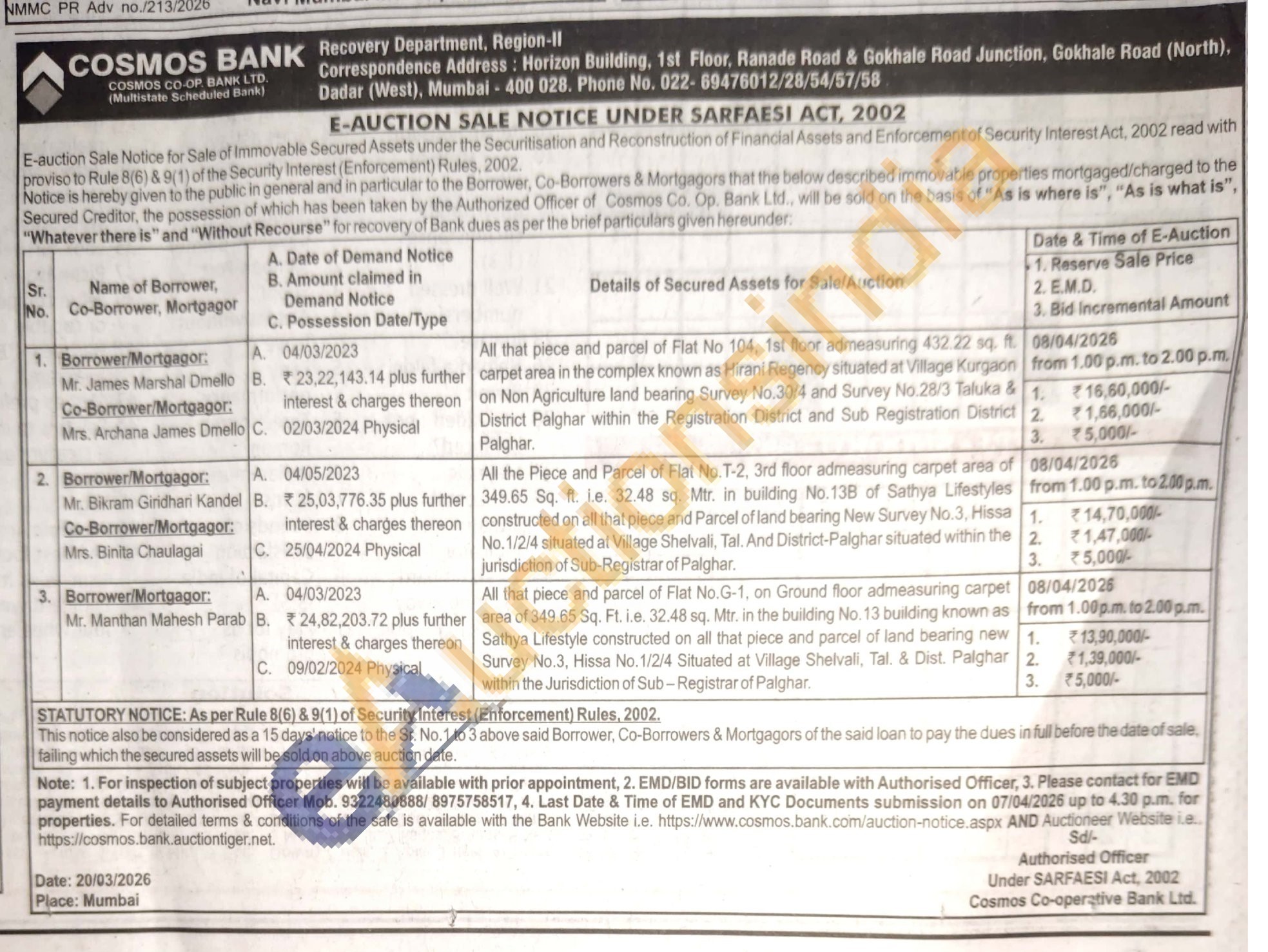 All that piece and parcel of Flat No.G-1, on Ground floor admeasuring carpet area of 349.65 Sq. Ft. i.e. 32.48 sq. Mtr. in the building No. 13 building known as Sathya Lifestyle constructed on all that piece and parcel of land bearing new Survey No.3, Hissa No. 1/2/4 Situated at Village Shelvali, Tal. & Dist. Palghar within the Jurisdiction of Sub-Registrar of Palghar