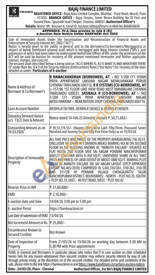 ALL THAT PIECE AND PARCEL OF THE PROPERTY ADMEASURING 756 SQ.FT. (INCLUSIVE OF SHARE IN COMMON AREAS) BEARING NO.36 ON SECOND FLOOR IN THE BUILDING KNOWN AS "AMRUTH ENCLAVE" SITUATED AT FLAT NO.36 2ND FLOOR SREE SAI NAGAR PONMAR KANCHEEPURAM 600127 TOGETHER WITH A 450 SQ.FT. UNDEVIDED SHARE IN ALL THAT PIECE AND PARCEL OF LAND EXTENT OF ABOUT 1800 SQ.FT. BEARING PLOT NO.36 IN AMRUTH ENCLAVE SRI SAI NAGAR LAYOUT (DTCP APPROVED LAYOUT NO.465/2010) COMPRISED IN S.NO.310/2A1, 310/2A2, 310/28 AND 311/2B OF PONMAR VILLAGE CHENGALPATTU TALUK KANCHEEPURAM DISTRICT. BOUNDARIES:- NORTH: - PLOT NO.35, SOUTH: -PLOT NO.37, EAST: -40 FEET ROAD, WEST: - PLOT NO.42
