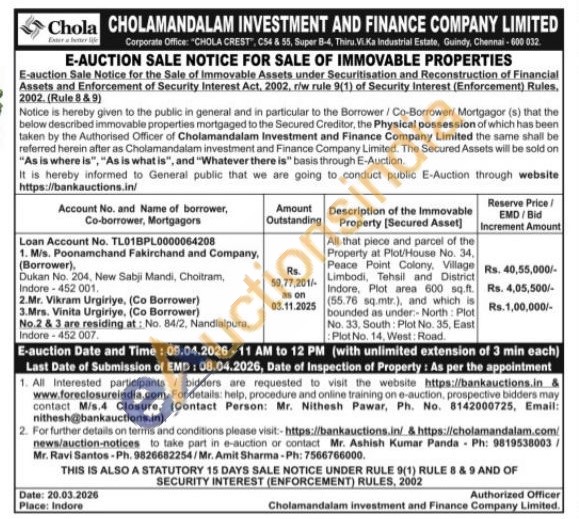 All that piece and parcel of the Property at Plot/House No. 34, Peace Point Colony, Village Limbodi, Tehsil and District Indore, Plot area 600 sq.ft. (55.76 sq.mtr.), and which is bounded as under-North: Plot No. 33, South: Plot No. 35, East Plot No. 14, West: Road.