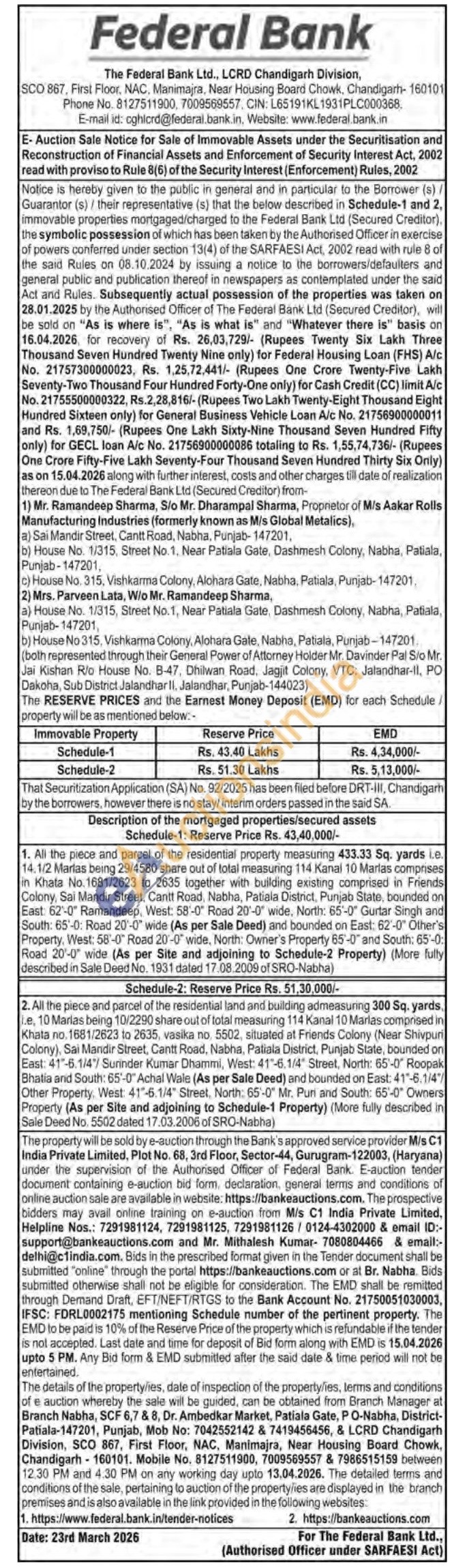 2. All the piece and parcel of the residential land and building admeasuring 300 Sq. yards, Le, 10 Marlas being 10/2290 share out of total measuring 114 Kanal 10 Marlas comprised in Khata no. 1881/2623 to 2635, vasika no, 5502, situated at Friends Colony (Near Shivpuri Colony), Sai Mandir Street, Cantt Road, Nabna, Patiala District, Punjab State, bounded an East: 41"-6.1/4" Surinder Kumar Dhammi, West: 41"-6.1/4" Street, North: 65-0 Roopak Bhatia and South: 65-0" Achal Wale (As per Sale Deed) and bounded on East: 41"-6.1/4/Other Property, West 41-5.1/4" Street, North: 65-0" Mr. Puri and South: 65-0" Owners Property (As per Site and adjoining to Schedule-1 Property) (More fully described in Sale Deed No. 5602 dated 17.03.2006 of SRO-Nabha)