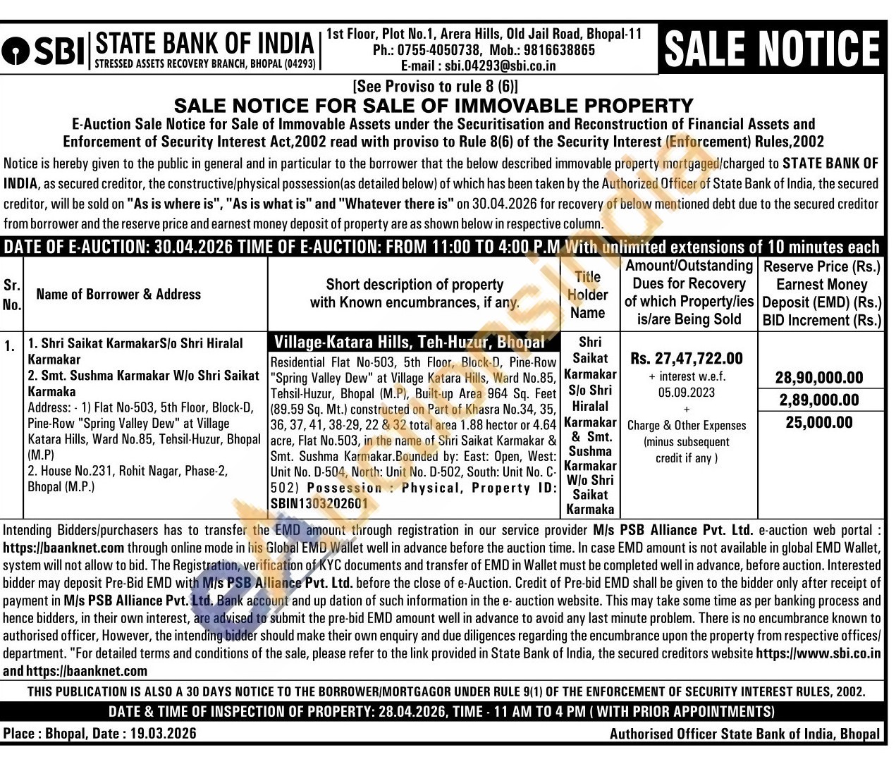 Residential Flat No-503, 5th Floor, Block-D, Pine-Row "Spring Valley Dew" at Village Katara Hills, Ward No.85, Tehsil-Huzur, Bhopal (M.P), Built-up Area 964 Sq. Feet (89.59 Sq. Mt.) constructed on Part of Khasra No.34, 35, 36, 37, 41, 38-29, 22 & 32 total area 1.88 hector or 4.64 acre, Flat No.503, in the name of Shri Saikat Karmakar & Smt. Sushma Karmakar.Bounded by: East: Open, West: Unit No. D-504, North: Unit No. D-502, South: Unit No. C. 502) Possession Physical, Property ID: SBIN1303202601