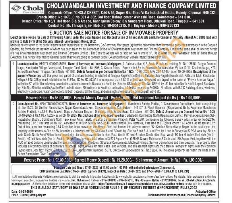 All that piece and parcel of land and building in situated at Tiruppur Registration District, PalladamSub-Registration district, Palladam Taluk, Karaipudur village S.F No.318 present subdivision No.318/1A, 1C,3A, 3C, 5C,5A1 in acre punjai acre 6.80½ of land was developed into layout in the name of "Pariyur Amman Nagar", insite No-87 within the following boundaries and measurements. Boundaries: North by: Site No. 86South by: Site No. 88 East by: 30 feet wide North South Layout RoadWest by: Site No. 60in this middle, East to West on both sides: 60 feetNorth to South on both sides: 40 feetAd measuring 2400 Sq. Ft. of land with R.C.C Building, doors, windows, electricity connection, water connectionand both deposits, all the fitting, and usual rights to road and common path ways etc.