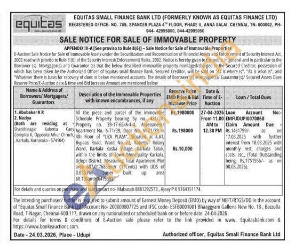 All the piece and parcel of the immovable Schedule Property bearing Sy no. 421/2A, Property no. 39-17-65/A-4-4, Assessment/Cany Apartment No. 6-71/39, Door No. VI-71/39 in 4th Floor of "LIZA PLAZA", Situated at 41, Bypaas Road, Ward No 22, Kabettu Rotary Ward, Karkala Kasba Village, Karkala Taluk, within the limits of Town Muncipality Karkala Udupi District. Measuring Total Apartment Plot area 687.017685qmtr (17Cents) with UDS of 0.0303%, Super built up area 60.10sqmar(67sqft