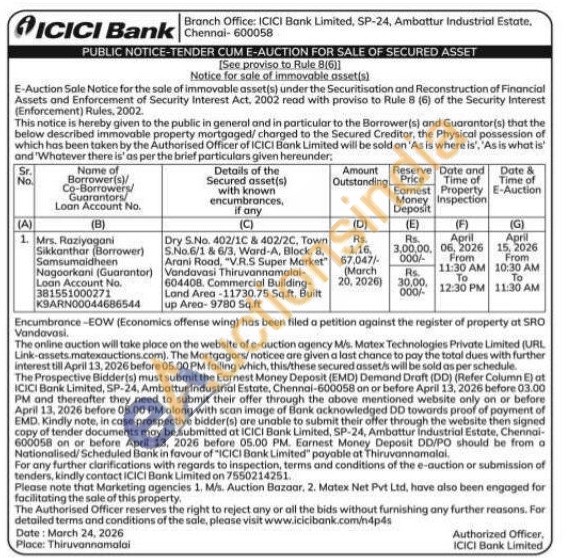 Dry S.No. 402/10 & 402/20, Town S.No.6/1 & 6/3, Ward-A, Block. 8, Arani Road, "V.R.S Super Market Vandavasi Thiruvannamalai-604408. Commercial Building-Land Area-11730.75 Sq.ft. Built up Area-9780 Sq.ft